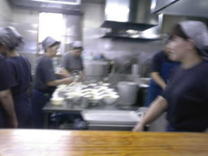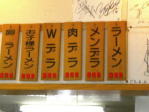 厨房には清潔な服装に身を包んだ従業員の方がテキパキと仕事をされています。メニューのデラとはデラックスの略。麺デラは緬の大盛り、肉デラはチャ−シュー緬のことです。