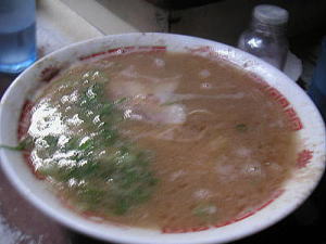 福岡の西鉄薬院駅の近く。以前はお昼もやっていたのですが、最近は、夕方から夜中の2時くらいまでが営業時間のようです。なんと言っても濃厚なスープ。スープを飲み干すとどんぶりの底にとんこつのくずが見えます。私が今までで食べた中で一番美味しいと思一杯です。私の後ろの赤提灯もう壊れそうな赤提灯が目印です。