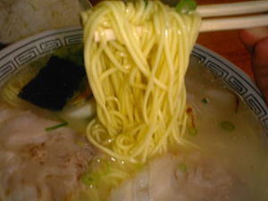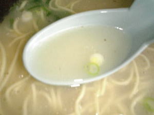 麺は細麺のストレート。とんこつラーメンではやはりこれが一番だと思います。スープは半透明の薄さ。かなり、あっさりです。