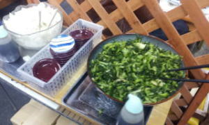 お店の中央に高菜と大根のサービス。