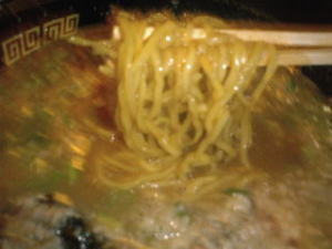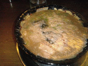 とんこつラーメン。背油たっぷり。見た目よりかなりあっさりしています。麺は縮れの中麺。どんぶりが黒いのは「風来軒」譲りでしょうか。