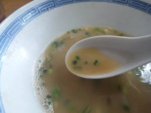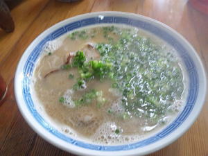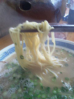 西鉄貝塚線の名島駅から徒歩15分ほどの所にあるお店。福岡市内からずいぶん離れた所にあるにもかかわらず、ラーメン通なら誰でも知っているという名店。看板には「長浜ラーメン」と書いてありますが、ご主人は長浜ラーメンと久留米ラーメン両方で修行されたそうで、双方のいいところを取り入れたラーメンになっています。都心部からこれだけ離れているにもかかわらず、お店はお昼時になると行列ができ、やはり、福岡県のラーメンの層の厚さを感じました。