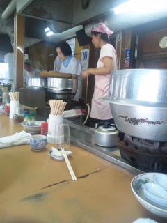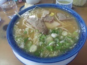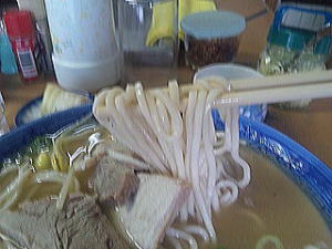 「うどん」?と思えるほどの太さの麺はスープにぴったり。触感も素晴らしく、あっという間に胃の中に納まります。豆もやしが入ってるのも特徴です。