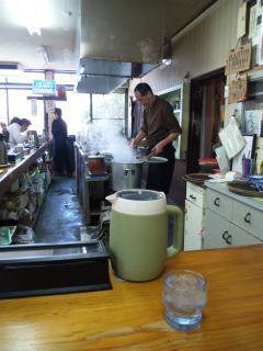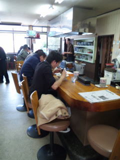 カウンター越しに、全作業が見られます。老舗の貫禄でしょうか。トッピングにニンニクがないのですが、店員さんにお願いすると、