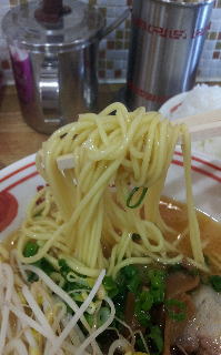麺は自家製麺の太麺。ここでは、バリカタではなく、硬めで注文します。
