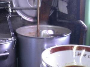 どんぶりに秘伝のたれを入れて、大きな釜で煮ているスープを並々と注ぎます。