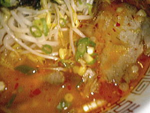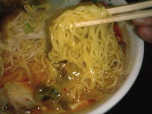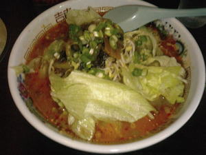これが激辛ザーサイラーメン。なんとレタスものっかっています。スープはしょうゆベースです。辛さは5辛位でしょうか。